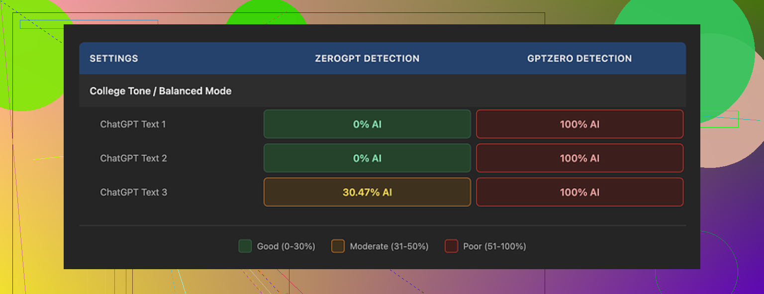 - GPTHuman introduces noise (odd grammar, weird word swaps) to confuse detectors, but that noise isn’t consistent. So one run looks “human-ish,” the next is a red flag.