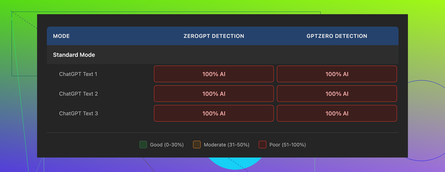 I ran a batch of texts through GPTinf, then pushed every result into GPTZero and ZeroGPT. Every single output was flagged as 100% AI. Not “likely AI”, not “mixed”. Straight 100%. This held across every mode I tried.