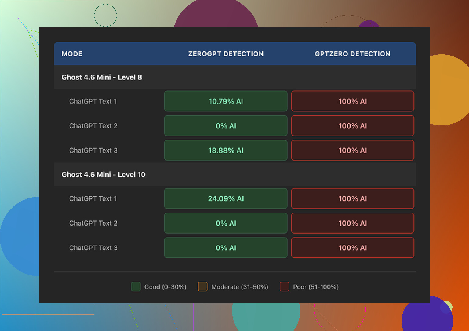 - GPTZero caught most outputs as AI, even at middle levels.